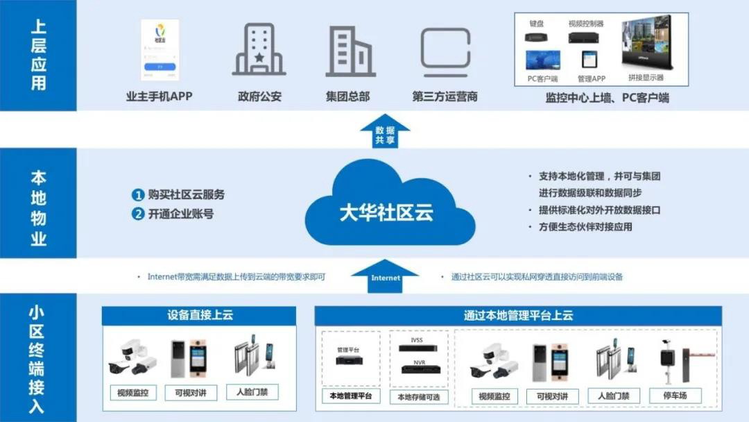 大華智慧地產社區云解決方案,讓社區生活智慧化、品質化,通過融合物聯網、大數據、視頻云多領域核心技術,專為社區打造公有云SaaS服務,實現小區人員、車輛、視頻數據整合,為運營管理提供強大支撐,為社區居民生活提供便捷體驗。