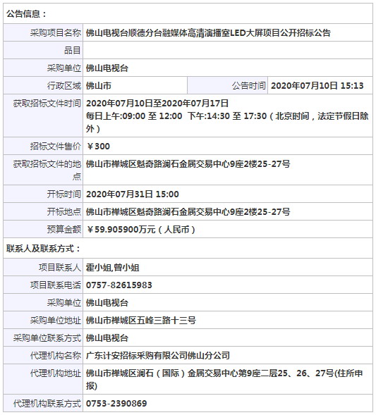 佛山電視臺順德分臺融媒體高清演播室LED大屏項目公開招標公告