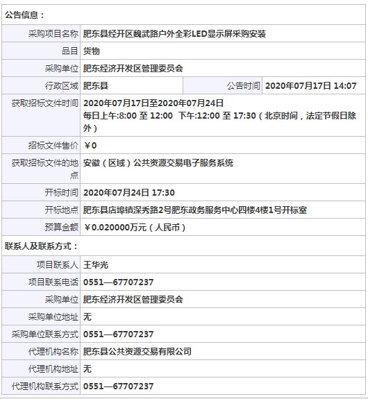 采購項目名稱: 肥東縣經(jīng)開區(qū)魏武路戶外全彩LED顯示屏采購安裝