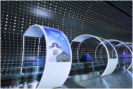 人在旅途,機場中轉站成為旅客掃去一身疲憊的落腳點。為了提升旅客飛行前后體驗,廣州白云國際機場著力于借助高科技手段激活機場空間,打造了一條集公共服務、藝術展示、廣告發布于一體的“時空隧道”,這在全國機場尚屬首創。在全長約200余米,空間面積超過2500平方米的時空長廊中,總共采用54臺NEC激光投影機,帶來一場奇譎夢幻的穿越之旅。