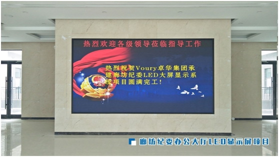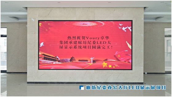 建黨99周年之際, 廊坊市紀委為更好的宣傳工作信息,保證黨的路線、方針、政策和國家的法律、法規及法令的貫徹執行,決定在辦公大廳新建一LED高清顯示屏, 為黨員以及黨組織的各項宣傳信息提供了更清晰,更便捷的展現方式。在經過專業研究和考察后,最終與Voury卓華達成合作