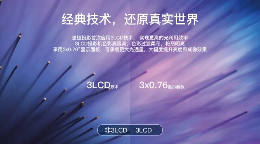 迪恒突破自我,在發展中樹立世界眼光,首次應用3LCD技術,實現更高的光利用率,搭配3*0.76顯示面板,實現高亮的同時,使觀眾感受到清晰的視覺效果和自然舒適的觀影體驗。