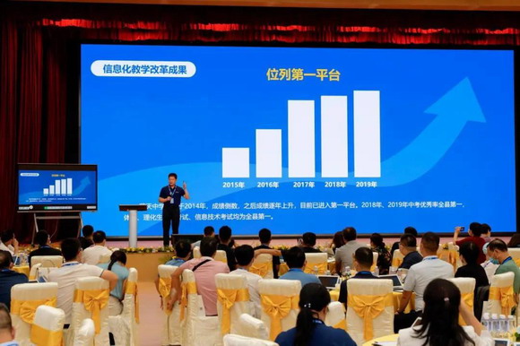 中國民辦教育協(xié)會常務理事、藍天教育集團董事長趙恒龍分享了他自2016年以來的信息化教學改革探索之路。藍天中學從建校初期的200名學生,增長到現(xiàn)在的2000多名學生,從成績倒數(shù)到目前的“第一平臺”,2018年、2019年的中考優(yōu)秀率全縣第一,體考、數(shù)理化實驗考試、信息技術(shù)考試全縣第一。他認為民辦教育要主動求變,從規(guī)模發(fā)展轉(zhuǎn)向內(nèi)涵發(fā)展,加大教學改革力度,推進智慧課堂建設,引領教育發(fā)展潮流。