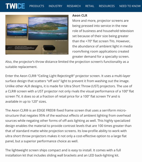 我們在反思看到的產品和吸取的教訓時, TWICE的工作人員已經為CES2020評選出了Picks獎的獎得主。只有提交到獎項計劃的產品才有資格獲獎,并根據其對消費電子行業的潛在影響進行評判。很榮幸,億立Aeon CLR®系列獲獎了。