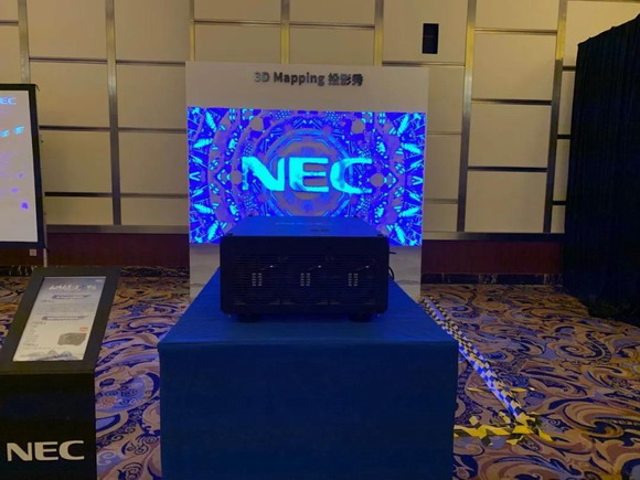 授牌儀式過后,NEC投影機產品經理張凱向大家翔實地介紹了移動式全景投影、全息紗幕投影、立體模型投影等新品解決方案。現場,醒目又炫酷的“NEC”LOGO格外吸睛,運用2萬流明英雄系列PX2000UL+ 雙色激光工程投影機,將品牌標志做出繽紛絢麗的動態效果。