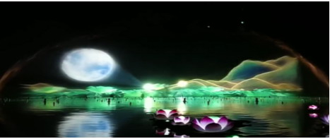 開會之余,客戶一行來到依山傍水的蓮花湖風景區觀賞了5D全息水舞秀。表演以湖中噴泉噴射形成的水幕作為載體,采用2臺NEC PH3501QL+ 4萬流明雙色激光工程投影機打造出50*15米高超大水上銀幕,隨著音樂與燈光的變化起起伏伏。PH3501QL+采用紅藍雙色激光光源技術,將圖騰、蓮花、閃電等場景元素的絢爛動態影像投射到水幕上,在光怪陸離的全息光影中把蓮花湖幻化成了“人間仙境”。
