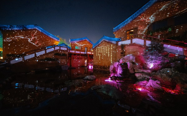 在園內《禧墻》區域,采用11臺Vivitek(麗訊) RU75953激光投影機打造而成,巧妙地利用原始建筑墻面,投射春夏秋冬四季不同景致。每當入夜,園內原本簡約古樸的仿宋建筑,在假山、水系、植物的映襯下,瞬間打造成一座360°開放式古典實景劇場。通過投影呈現的動態四季美景,瞬間將每一位游客帶入古樸而夢幻的仙境之中,亭臺樓榭、小橋流水、霓虹初上,一切都是如此之渾然天成。