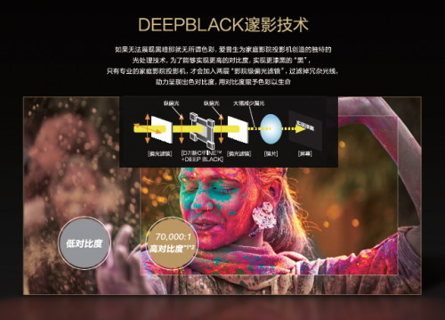 高亮度會給遮光條件不好的環境帶來更好的畫質,但是過高的亮度,有可能會導致對比度的下降,比如讓黑色沉不下去,嚴重的會變為灰色,從而降低家庭影院的效果。明和暗的對比,直接決定了畫面帶來的沖擊力,對比度越大意味著能夠呈現的黑白過渡細節越多,色彩層次亦會更加細膩。愛普生CH-TW5800投影機,通過愛普生獨有的專門為家庭影院創造的DeepBlack技術,對比度高達70000:1*3*4,讓亮的地方更亮讓暗的地方更暗。無論原電影畫面色彩是深抑或是淺,都能完整展現出畫面的景深與細節。無論是白天使用還是晚上使用,都能帶來清晰、明亮的影像,輕松觀影,還等什么。