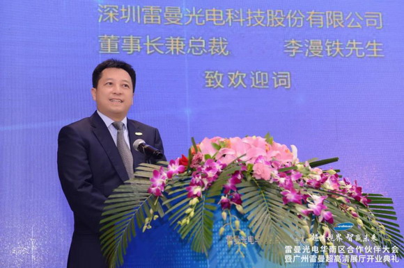 雷曼光電董事長(zhǎng)兼總裁李漫鐵致歡迎詞:“廣州是我的第二故鄉(xiāng),我在華南理工大學(xué)無(wú)線電專業(yè)度過(guò)了充實(shí)的四年,這段經(jīng)歷為后來(lái)我創(chuàng)立雷曼光電打下了堅(jiān)實(shí)的基礎(chǔ)。廣州是國(guó)內(nèi)少數(shù)幾個(gè)將超高清作為城市級(jí)戰(zhàn)略的都市,大力推進(jìn)“世界顯示之都”、國(guó)家超高清視頻應(yīng)用示范區(qū)、國(guó)家超高清視頻產(chǎn)業(yè)內(nèi)容制作基地建設(shè)。雷曼光電作為全球領(lǐng)先的超高清LED顯示專家,從六年前開(kāi)始專研COB先進(jìn)技術(shù),在Micro LED超高清顯示產(chǎn)品的研發(fā)和生產(chǎn)方面走在國(guó)際前列。Micro LED是公認(rèn)的終極顯示技術(shù),市場(chǎng)潛力巨大,我們希望與廣大客戶及合作伙伴朋友們共享商機(jī),暢游藍(lán)海。”