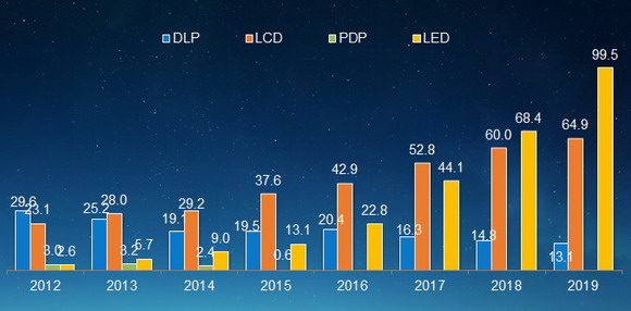 進入2019年,隨著COB技術的逐漸穩定以及市場的進一步普及,更多的企業進入COB市場,COB市場迎來暴發式增長。2019年度小間距LED銷額99.5億元,同比增長55.1%,已成為大屏幕拼接市場的主力軍。其中COB產品銷售額同比增長103%,增速遠超其他大屏幕顯示產品。COB產品主要客戶集中在政府部門的中高端用戶,應用于指揮、監控、會議。