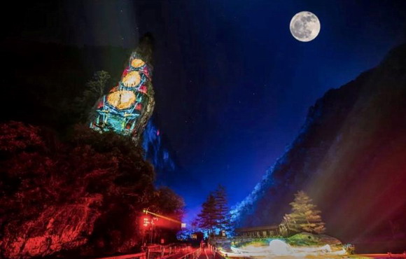 表演的另一個亮點是在 300 米高的絕壁上呈現的宏大影像,其主題是 3000 年傳承不斷的民歌《巴山背二歌》,歌曲描述了來自巴山的“背二哥”們用方肩背架在懸崖峭壁之間運送貨物的艱險歷程。借助科視性能出色的 Crimson 系列高亮度投影機,這幅動人的投影目前是全國規模最大的山壁 3D 投影。