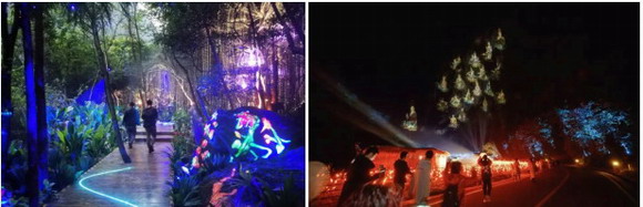 該表演還具備獨特的《棧道秘境》、《叢林秘境》觀影方式。在表演區域中的蜿蜒溪流和茂密森林的環繞下,游客們行走于 500 米長的棧道的同時,也可通過逼真的紗幕投影欣賞引人入勝的故事,而這一切都依靠科視的 1DLP 投影機來實現。