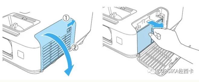 多用于一些工程/高端家用投影機(jī),此類濾網(wǎng)的清潔更換都需要將濾網(wǎng)從機(jī)身上取下: