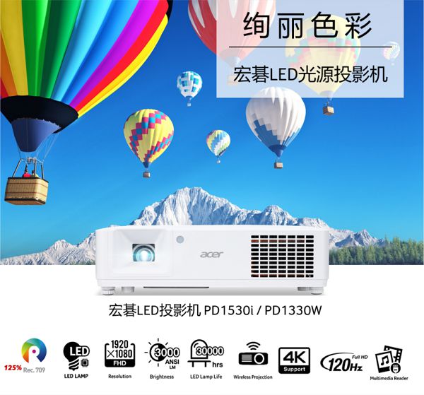 近日,宏碁發(fā)布兩款采用LED光源的新款家用辦公投影機——PD1530i和PD1330W,投影畫面色彩絢麗,3000流明高亮度,使用壽命長,功能豐富且人性化,適用于家用娛樂及商務辦公等多種場景。對于今年受新冠特殊情況影響,不得不長期在家辦公的用戶和上網(wǎng)課的孩子們來說,LED光源的投影機是不錯的選擇。