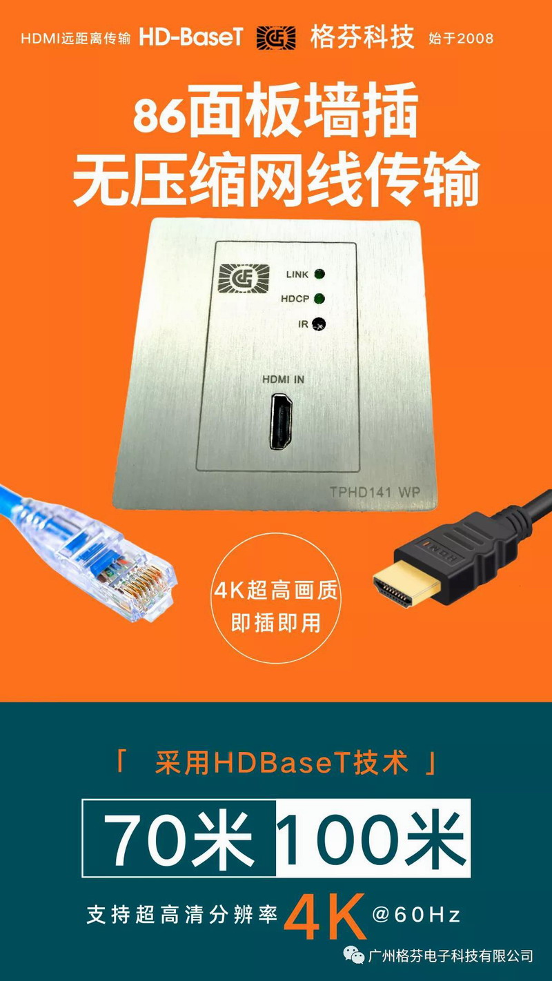 通過Cat6雙絞線,可實(shí)現(xiàn)長達(dá)70~100米的信號(hào)傳輸,遠(yuǎn)遠(yuǎn)優(yōu)于目前的HDMI、VGA、Display-Port標(biāo)準(zhǔn),是較遠(yuǎn)距離傳輸上的不二選擇。常見如投影機(jī)、電視、混合矩陣、高清播放器等。支持POC/POE功能。, 設(shè)有HDMI輸入接口,將接收的HDMI信號(hào)轉(zhuǎn)換為HDBaseT格式,并通過RJ45接口輸出。同時(shí)GEFFEN格芬科技GF-TPHD桌插/插墻/地插系列還支持紅外輸入和RS232輸入,可同時(shí)將IR信號(hào)以及RS232信號(hào)與HDBaseT信號(hào)一同輸出給接收端。
