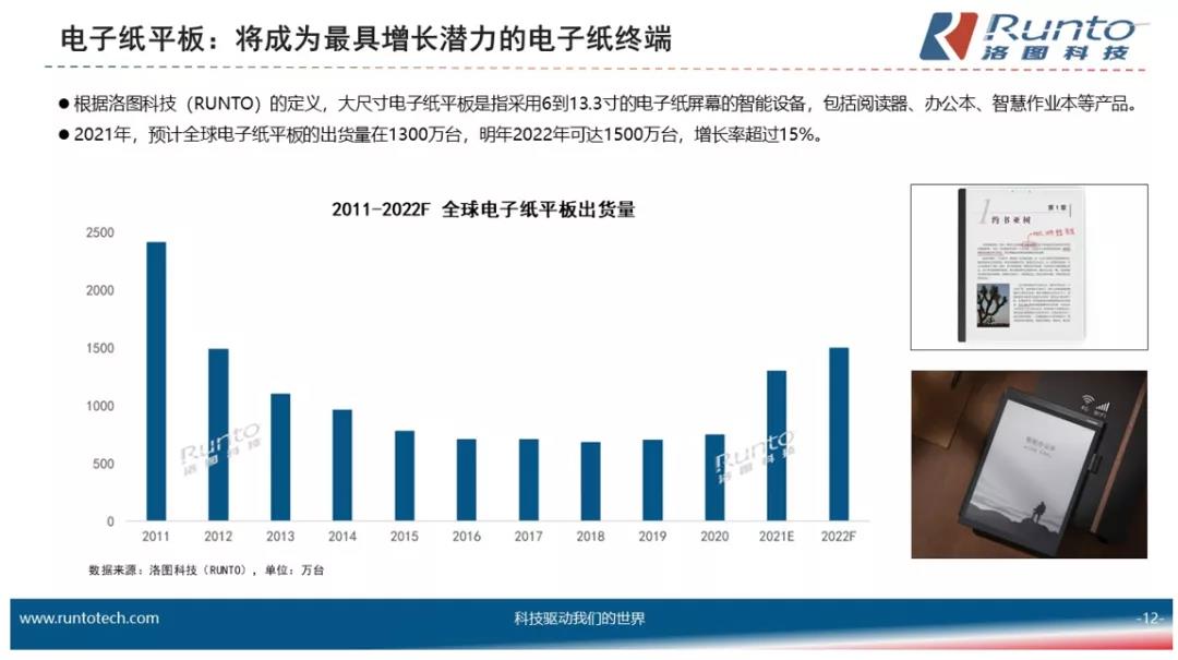 根據洛圖科技(RUNTO)數據,2021年預計全球電子紙平板的出貨量在1300萬臺,明年2022年可達1500萬臺,增長率超過15%。