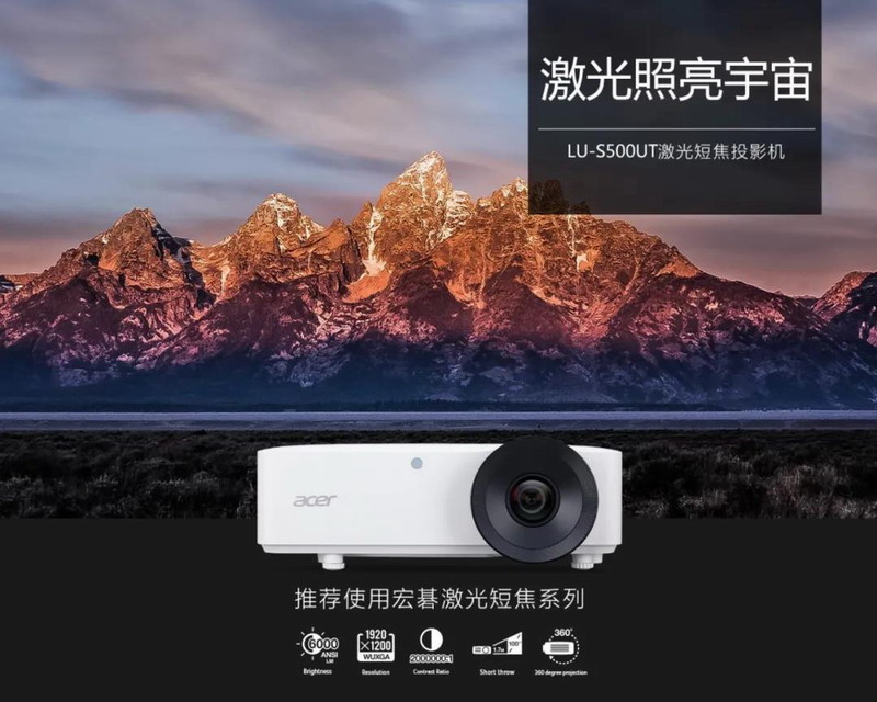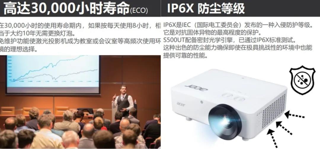 值得一提的是,宏碁LU-S500UT投影機具有Eco環保模式,不僅能夠延長使用壽命,同時可以降低噪音和功耗,十分符合企業環保和節約成本的管理理念。