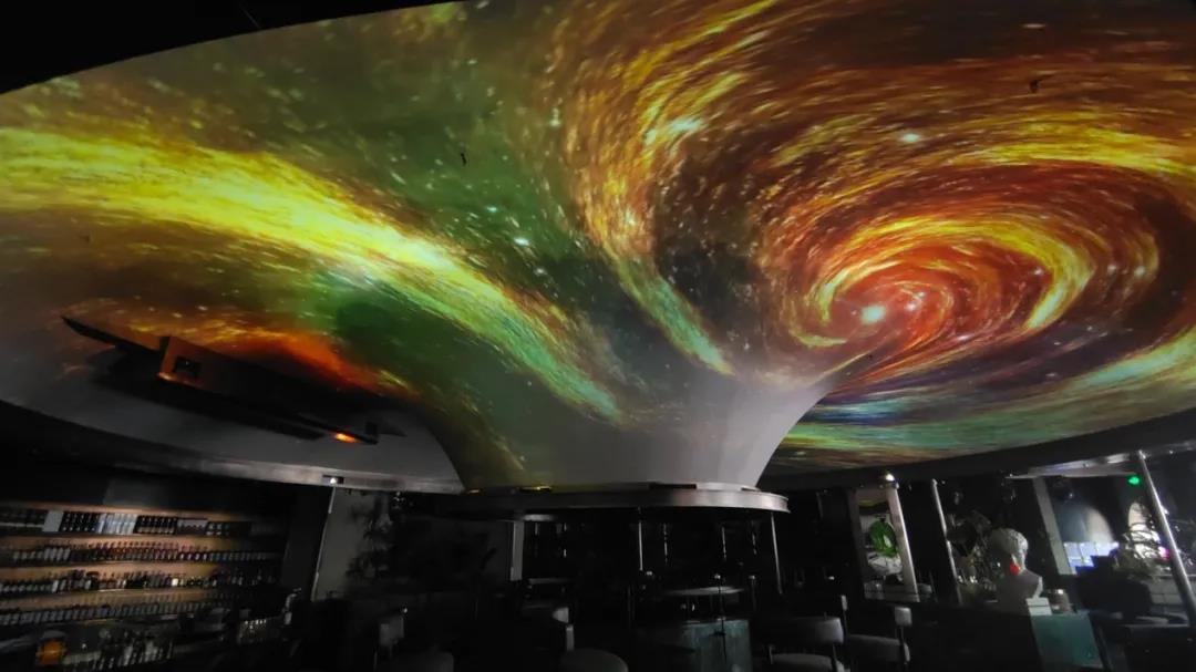 Tao'S酒吧的裝修方案由意大利知名設計師傾情打造,設計之初就定位大膽、創新,提出用投影機打造星空云海的迷離幻景。得益于16臺NEC騎士系列CS3300HL的精彩演繹,蜿蜒流動的星空與采用仿真火焰設計的吧臺完美融合,搭配富有迷幻色彩的動植物布置及各種帶有復古紋理和復古色調的裝飾物,星海蒼穹,光影流動,酷炫又不失浪漫氛圍。