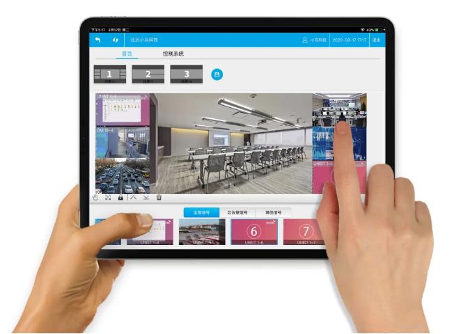 小鳥青鸞分布式可視化軟件平臺橫向打通各子系統的協作通道,對大屏顯示控制系統、視頻處理系統、音頻處理系統、中央控制系統、媒體錄播系統等進行統一管理,實現互聯互控。使用者無須對應接口編號查找視頻源,通過PAD上顯示的預覽畫面即可鎖定相應輸入源,實現快速切換,防止誤操作。支持在同一平臺下,多個人員分別操作不同應用,完成整體協作,所有操作完全同步顯示。