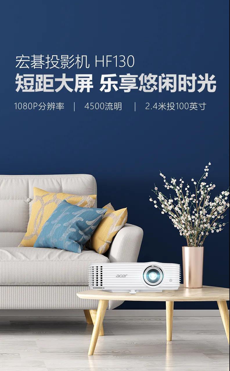 4500流明高亮度,1.3倍大變焦、家用黃金投射比,1080P全高清畫面,120Hz高刷新,從不失”幀“運動圖像順滑無卡頓拖影。年終宅家度假的各位小伙伴們,無論高清電影、歡笑綜藝,還是電競游戲,宏碁(Acer)家用投影機HF130,都能滿足您的居家悠閑大屏需求!現在宏碁投影京東自營旗艦店火熱預售中,更有贈品及各項活動等您來~