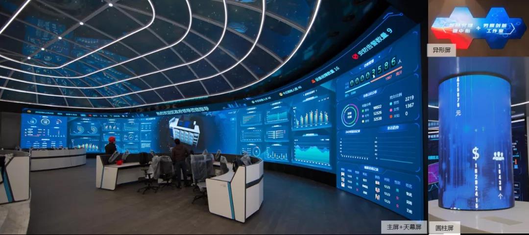 “企業(yè)電智繪”是國網(wǎng)上海電力智慧能源云平臺示范點的成果之一。智慧能源云平臺的LED大屏幕顯示系統(tǒng)選用了GQY常規(guī)小間距LED、柔性LED屏、異形LED屏進行了“多屏融合拼接“,主屏和弧形側(cè)屏采用了2款不同點間距的GQY黃河系列常規(guī)小間距LED,輔屏采用了J系列柔性屏以及A系列異形屏,拼接成圓柱屏、六角屏、天幕屏。