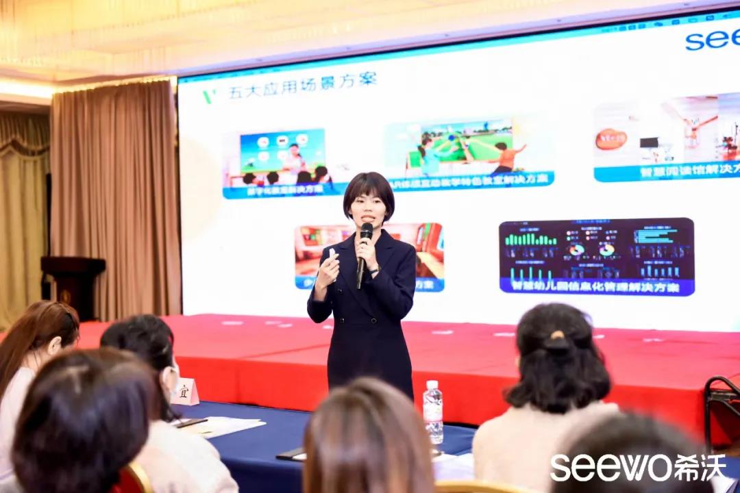 信息化時代,推動科技與教育的融合是大勢所趨。迎合時代趨勢,契合科學幼小銜接的理念,希沃在活動現場帶來了智慧幼兒園整體解決方案,致力于推動幼兒教育的轉型升級。希沃海口辦客戶顧問梁映雪在現場為與會者們講解了方案的研發初衷與諸多功能性亮點。