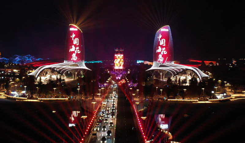超酷炫!海花島雙塔創意燈光秀成“打卡”熱點