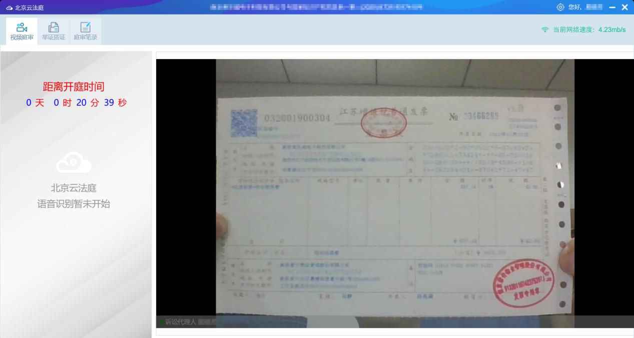 7、線上開庭效果對(duì)比展示。如下是“北京云法庭”舉證效果展示,以發(fā)票單據(jù)舉證為例: