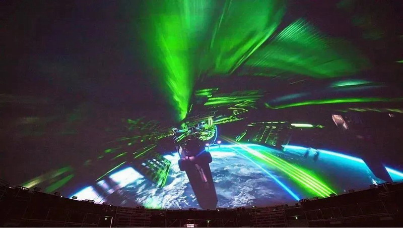 光影視界是典型的球幕系統(tǒng),其半球形銀幕宛如可以容納浩瀚蒼穹一般,將觀眾的視角全部“禁錮”在銀幕畫面之中,使得觀眾目光所到之處幾乎全部是栩栩如生、絢麗多彩的逼真畫面。