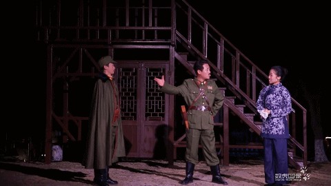 舞臺呈現三個表演空間,阿慶嫂和眾人定計如何智斗胡司令,前區一片熱鬧的婚禮場景,后區(二樓投影)舞蹈演員用肢體演繹定計的內容。可移動雙面鼓、屏風,樓梯等道具,不僅迅速有效的調度演員,還增強了舞臺張力。