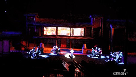 演藝由《崗哨門關》《紅影潛伏》《情生》《茶館智斗》《游行》《迎親》《智斗胡司令》七部分組成,通過橫涇老街行進式夜游,層層鋪墊、遞進,把觀眾引導到橫涇劇場看一出好戲。正所謂“一千個讀者有一千個哈姆雷特”,每一個到這里的游客,自有一出屬于你的《暗戰·沙家浜》。