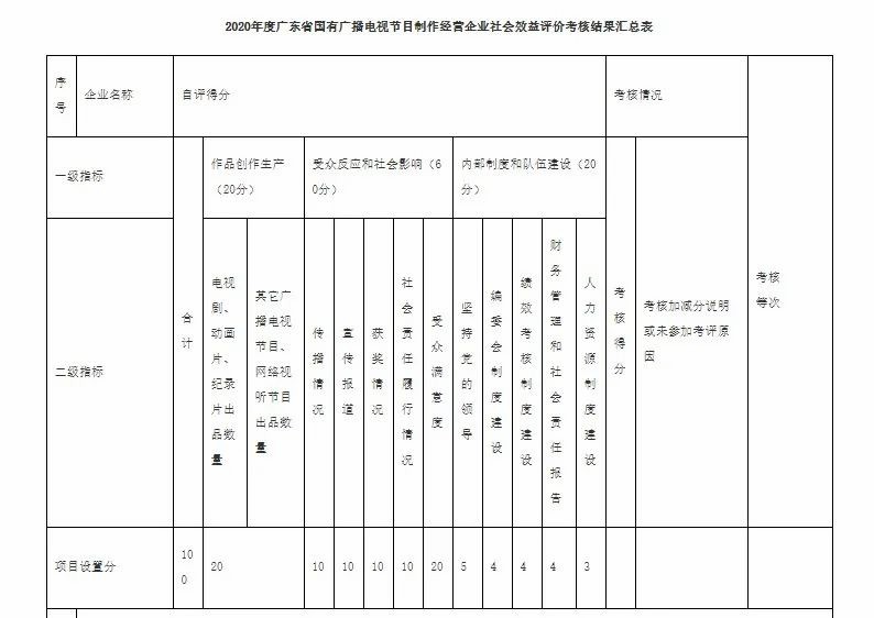據了解,為提高國有廣播電視節目制作經營企業社會責任意識,促進廣東省廣播電視節目制作經營企業健康繁榮發展,根據中央宣傳部、國家廣播電視總局的廣電發〔2019〕107號文件,廣東省廣播電視局決定在全省范圍內開展該項考核工作。