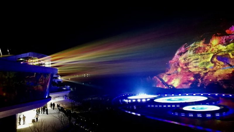 令一面長255米,高80米,面積超過2萬平方米的崖壁瞬間成為了一塊平整“大銀幕”。用綺麗的色彩和完整清晰的畫面,在凹凸不平的山體上描繪了一幅波瀾壯闊的畫卷。精心設計的視頻內容與現代光影的結合,給觀眾們帶來極佳的沉浸式體驗,感受百年時光。