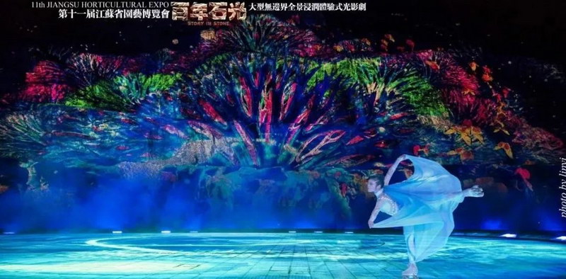 在第十一屆江蘇省園藝博覽會開幕式上,以南京湯山崖壁為創作背景的全景沉浸光影秀《百年石光》在崖壁劇場同步上演。該演出以山為幕,以崖壁為劇院,通過舞臺情景變化來詮釋時代變遷。