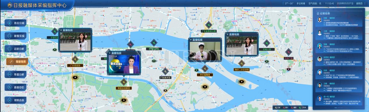 基于GIS地圖,實時顯示記者、采訪車輛位置信息,結合記者姓名、部門、所有在跟稿件標題、任務狀態等信息,實時呈現記者任務、采訪實時位置、記者在跟報題軌跡,實現采編指揮中心實時連線前方記者進行報道指揮。