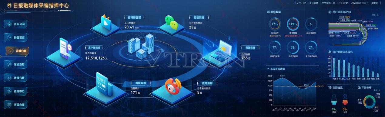 威創智慧融媒體可視化解決方案,把融媒體中央廚房的綜合業務數據匯聚與呈現、全面的數據分析與決策、綜合可視化指揮調度等融為一體,以“實時、智能、可視”的方式輔助媒體用戶進行管理和決策,顯著提升工作效率,充分發揮融媒體中央廚房“一體策劃、一次采集、多種生成、多元傳播、全天滾動、全球覆蓋”的核心價值。