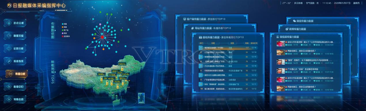 威創融媒體可視化解決方案專注于為用戶提供資訊匯聚、熱點分析、采編預測的可視化服務,廣泛應用于新媒體、報業等采編指揮中心,已為多家融媒體提供了高分可視化應用服務,助力用戶實現“一體策劃、一次采集、多種生成、多元傳播、全天滾動、全球覆蓋” 資訊采編新模式。