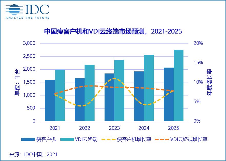 據(jù)IDC預(yù)計,至2025年,中國瘦客戶機(jī)市場規(guī)模將超過207萬臺,五年復(fù)合增長率將達(dá)到6.7%。桌面云終端VDI市場規(guī)模將突破275萬臺,五年復(fù)合增長率將超過8.5%。