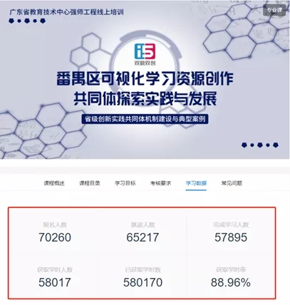 2020年,番禺區學習共同體平臺課程入選廣東省教育技術中心強師工程(以下簡稱“強師工程”)在線培訓課程。目前,“強師工程”共組織兩期大規模培訓,惠及全省7萬余名教師,培訓時長近60萬學時。