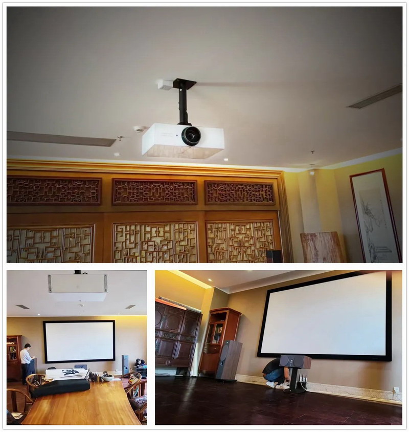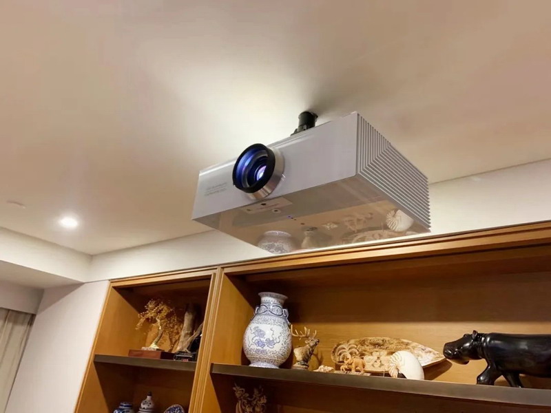 Crytal4-Sh白色款吊頂與客廳相得益彰,通過編程可一鍵實現16:9與2.35:1之間的切換,輕松投影140寸編織透聲幕。