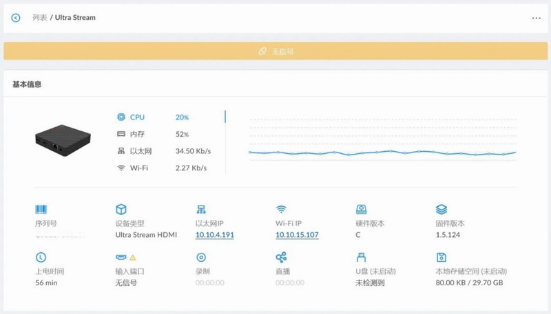 在Magewell Cloud“所有設備”頁簽中,點擊設備名稱,可查看對應設備運行狀態、IP地址、固件版本等基本信息。