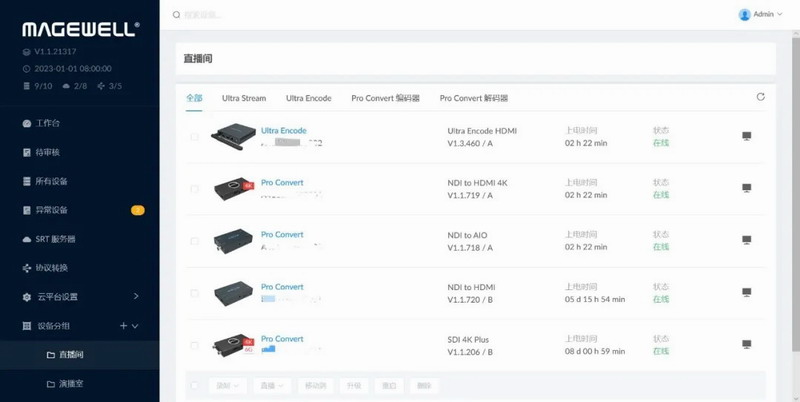 無論是美樂威Ultra Stream系列直播錄制編碼盒、Ultra Encode系列網絡編碼盒或Pro Convert系列編解碼器,都可以注冊到Magewell Cloud上,集成商、管理員和 IT 人員可以通過基于瀏覽器的直觀界面輕松配置和管理任意地點的多臺美樂威IP設備。