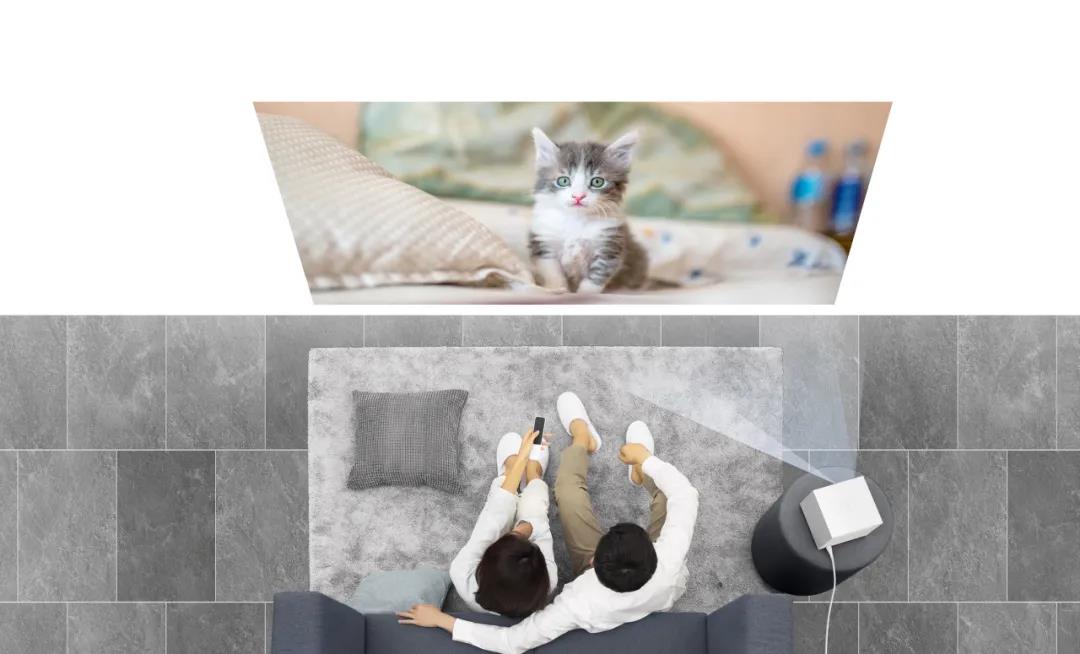 1.1 : 1 的投射比,擺放距離與投影畫面寬度幾乎等同,讓你不再費心計算擺放距離的同時更省空間。距離投射面 2.5m 即可坐擁百吋 1080P 全高清巨幕畫面*。