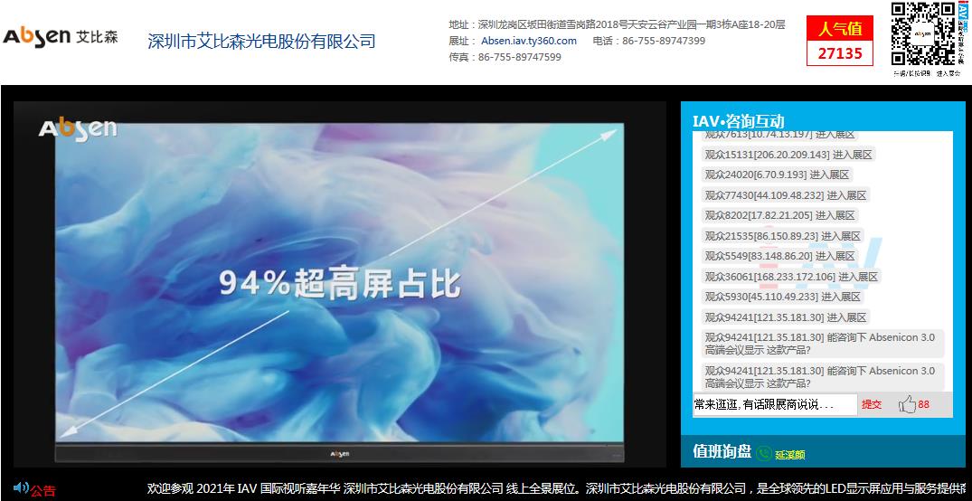 艾比森作為LED行業沉淀多年的品牌,攜旗下多款高端系列產品及解決方案亮相本屆IAV國際視聽嘉年華線上展,為渠道及用戶呈上精彩的視覺盛宴。