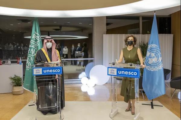 ▲簽署現場,阿爾烏拉皇家委員會主管兼沙特阿拉伯文化部長 Badr bin Abdullah Al-Saud(圖左)與聯合國教科文組織總干事 Audrey Azoulay(圖右),圖源自網絡。