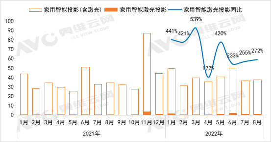 2021-2022年家用智能投影(含激光)與家用激光投影銷量(萬臺(tái))
