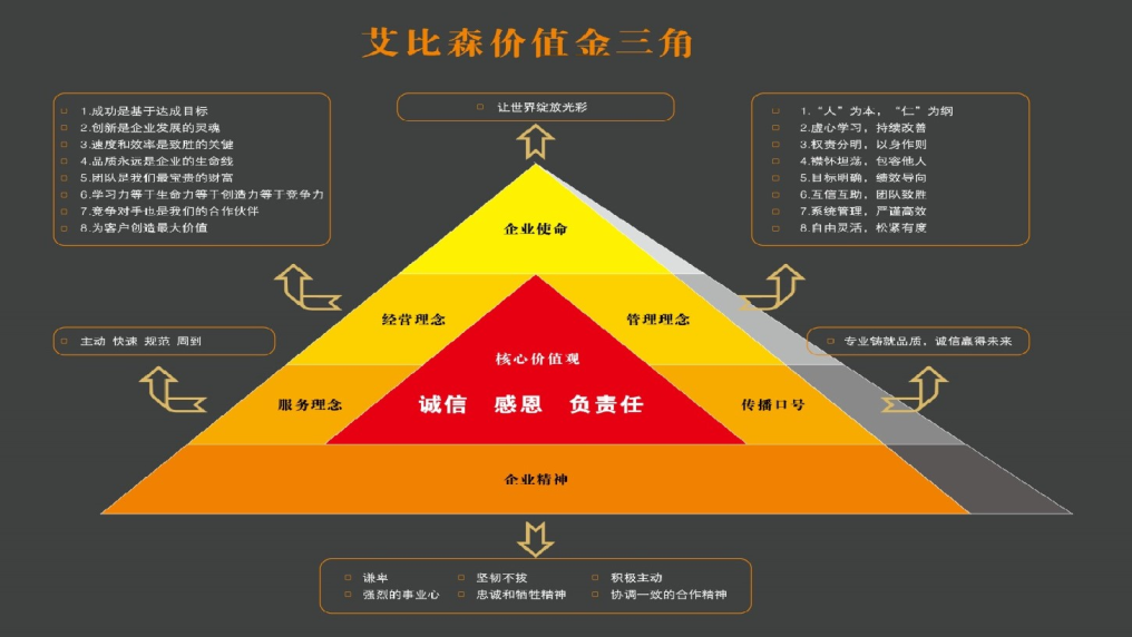 我們花了三個(gè)月時(shí)間提煉出了企業(yè)文化的4.0版本,內(nèi)容包括我們的使命、愿景、核心價(jià)值觀,還有艾比森的企業(yè)精神。