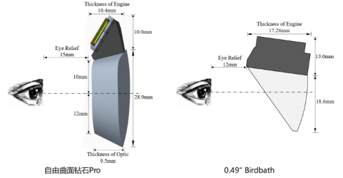 同時,得益于自由曲面鉆石Pro高光能利用率,在相同入眼亮度的情況下,相比Birdbath方案,自由曲面鉆石Pro可實現更低的功耗,擁有長續航、低發熱的優勢。另外,自由曲面鉆石Pro還具有更大透視角度、更清晰的中心和邊緣畫面等多項特點。