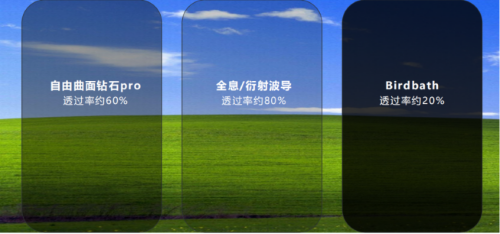 在透視率上,自由曲面鉆石Pro采用3000nits的高亮屏時,在保證900nits的高入眼亮度下,可將透過率提升至60%,并保證30%的光能利用率,高光能利用率使得AR整機的OLED選型更豐富,亮度500nits以上顯示屏均可使用。