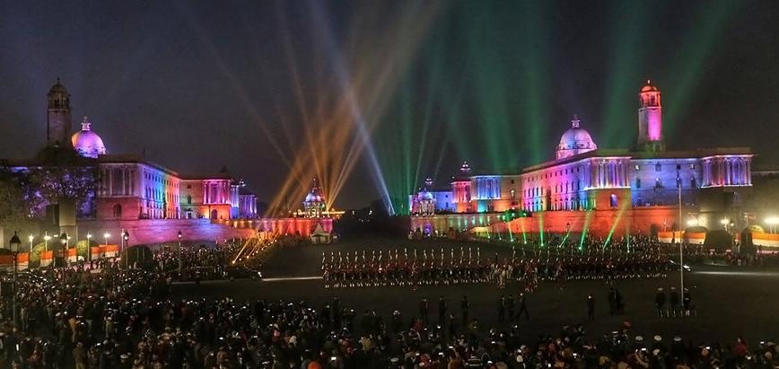 這些專為紀念印度獨立 75 周年設計的迷人視覺效果與在主權大道上的維結亞朝客(Vijay Chowk)舉行的盛大閱兵儀式相得益彰。該儀式由印度武裝部隊的軍樂隊、管樂和鼓樂合奏樂隊、以及喇叭手和號手聯合組成。每年 1 月 29 日舉行的“鳴金收兵”儀式是有著數百年歷史的傳統軍事慶典,可以追溯到那些軍隊在日落時從戰場撤離的歲月。在印度,精心籌劃的軍事儀式正式標志著共和國日慶祝活動圓滿結束。
